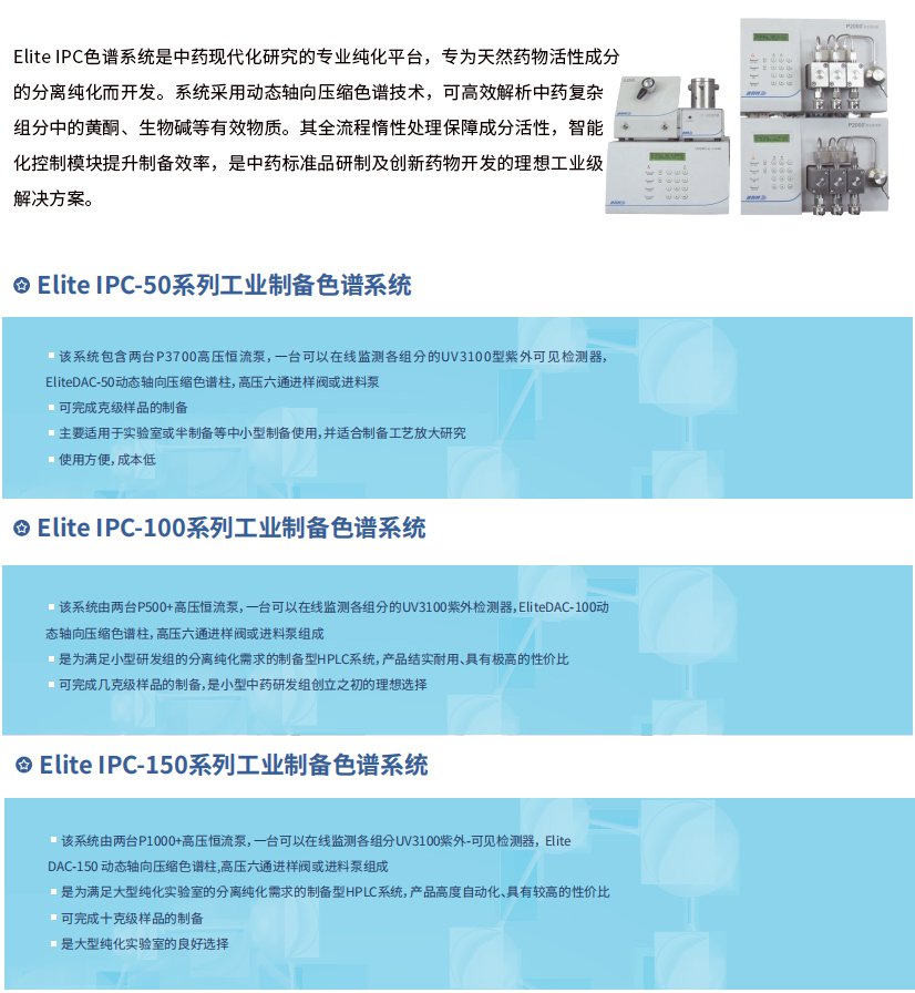 依利特科技高壓半制備液相色譜系統(tǒng)EClassical3500/3700,將分析和半制備一體化,為您提供完整的分析和制備化合物的自動(dòng)HPLC應(yīng)用方案。該系統(tǒng)可以方便實(shí)現(xiàn)分析與半制備系統(tǒng)之間的切換,還可完成樣品進(jìn)樣、餾分收集等功能。依利特工業(yè)制備Elite IPC色譜系統(tǒng),完成從幾克級至十克級樣品的制備,是小型中藥研發(fā)和大型純化實(shí)驗(yàn)室的良好選擇。