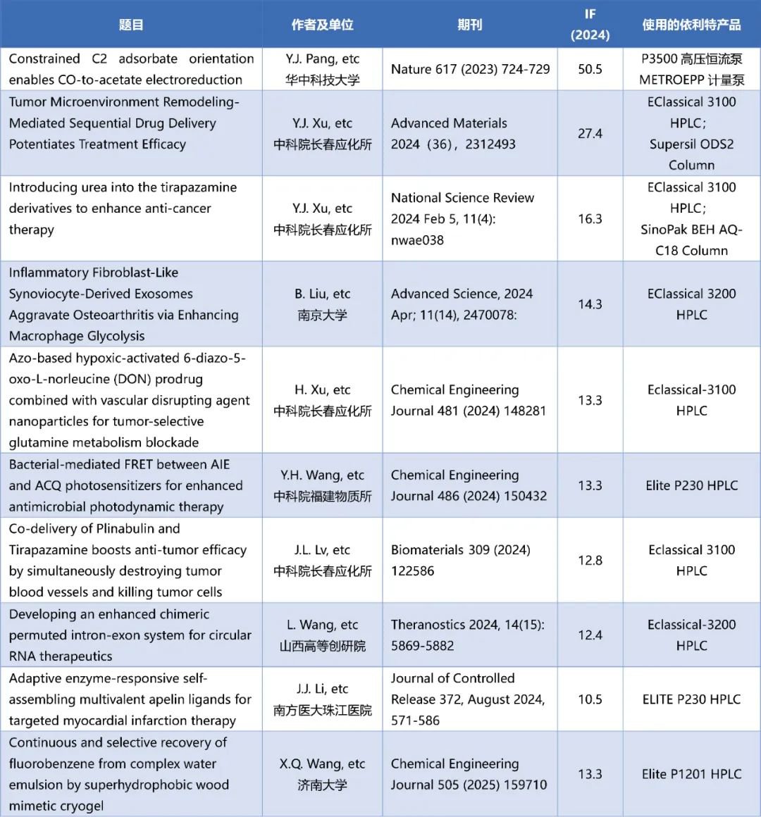 近年來,在中國科研實(shí)力的快速崛起中,國產(chǎn)分析儀器扮演了重要角色。其中使用為廣泛的高效液相色譜,在科研領(lǐng)域的先進(jìn)前沿應(yīng)用也逐漸打破“進(jìn)口依賴”。以依利特高效液相色譜、制備/半制備色譜和色譜柱為代表,國產(chǎn)液相色譜儀器及耗材的性能已然獲得了眾多科研工作者的信任,成為協(xié)力完成高水平科研項(xiàng)目背后的隱形功臣。下表列舉了部分近年發(fā)表在Nature、Advanced Materials、National Science Review、Advanced Science、Chemical Engineering Journal、Biomaterials等影響因子 IF > 10的刊物上的部分文獻(xiàn)。
