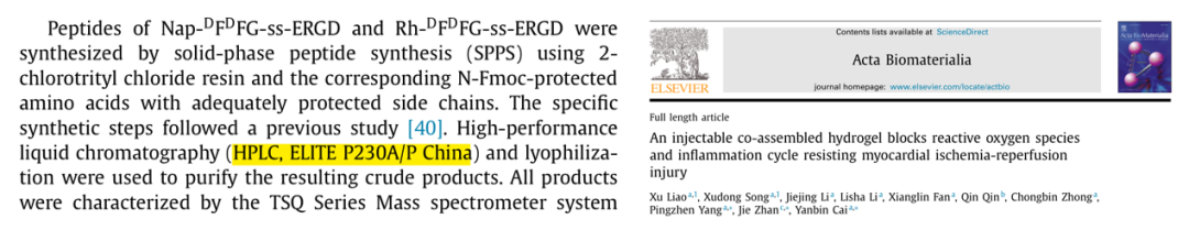 英國(guó)著名工程技術(shù)-材料科學(xué)和生物材料類期刊Acta Biomaterialia在2022年7月刊登一篇《An injectable co-assembled hydrogel blocks reactive oxygen species and inflammation cycle resisting myocardial ischemia-reperfusion injury》文章。該文章設(shè)計(jì)并制備了一種可注射的共組裝水凝膠體系,通過(guò)阻斷活性氧和炎癥循環(huán)抵抗心肌缺血再灌注傷害。其中人工合成多肽的分析純化使用的就是依利特的P230A/P分析-半制備一體化液相色譜系統(tǒng)及SinoChrom ODS-BP 系列的半制備色譜柱。
