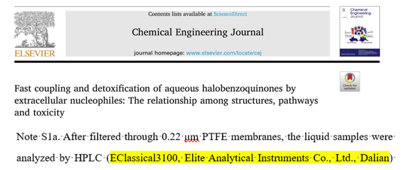 《Chemical Engineering Journal》是工程技術(shù)與化學(xué)化工領(lǐng)域有影響力的三大刊物之一,在中科院分區(qū)中為工程技術(shù)/化學(xué)/環(huán)境類1區(qū)Top期刊,2022年期刊新影響因子為16.744。該期刊在2022年6月發(fā)表一篇名為《Fast coupling and detoxification of aqueous halobenzoquinones by extracellular nucleophiles: The relationship among structures, pathways and toxicity》的文章。該文章主要研究了31種親核試劑(包括含酚羥基、氨基、硫醇等O/N/S官能團(tuán)的藥物、氨基酸等)對(duì)于二氯苯醌降解去除效果的影響。其中二氯苯醌含量測(cè)定使用的就是依利特自主研發(fā)生產(chǎn)的EClassical 3100高效液相色譜儀。
