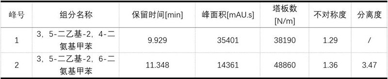 二乙基甲苯二胺是兩種異構(gòu)體混合物,即3,5-二乙基-2,4-二氨基甲苯和 3,5-二乙基-2,6-二氨基甲苯,簡稱DETDA,長期暴露在空氣中顏色會變深,二乙基甲苯二胺易燃,腐蝕性強,皮膚、眼睛接觸能引起刺激和嚴重灼傷,誤服有害。依利特使用EClassical 3200液相色譜儀匹配經(jīng)典的SinoPak C18色譜柱,對二乙基甲苯二胺異構(gòu)體進行分析檢測。