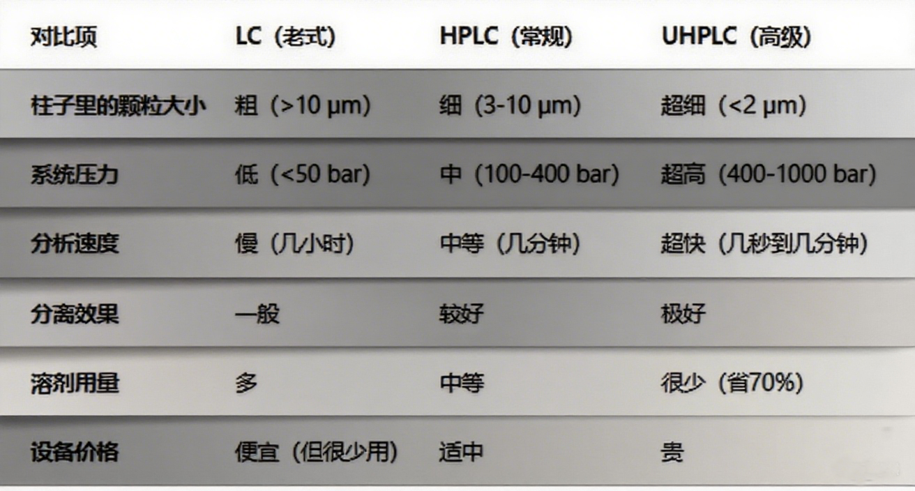 網(wǎng)上不少網(wǎng)友都在關(guān)注 LC、HPLC 和 UHPLC 的區(qū)別,依利特特意為大家梳理清楚。液相色譜(LC)、高效液相色譜(HPLC)和超高效液相色譜(UHPLC),在分離效率、分析速度、壓力范圍和應(yīng)用場(chǎng)景上,有著各自鮮明的特點(diǎn)。下面就來(lái)看看它們的核心區(qū)別: