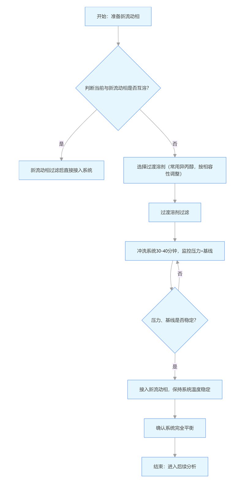 換流動相先看相容性!換之前得確認當前用的和新?lián)Q的流動相能不能互溶。要是不兼容,必須找個跟兩者都能溶的過渡流動相,先把系統(tǒng)洗干凈才行。?