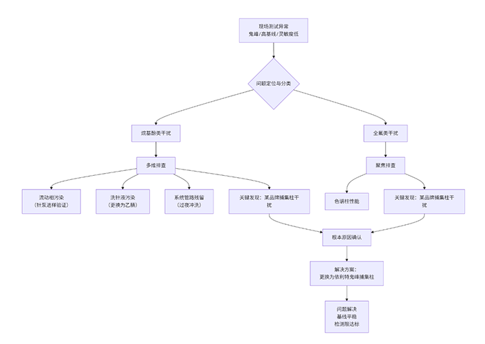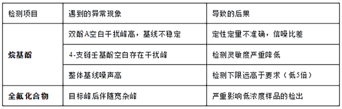 3.關鍵發(fā)現(xiàn):捕集柱是“元兇”:在排查全氟化合物的雜峰和烷基酚的高基線問題時,通過對比試驗發(fā)現(xiàn),系統(tǒng)中使用的某知名品牌捕集柱是引入干擾的根源。