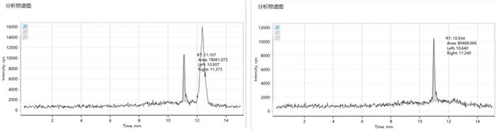 右側:更換為依利特鬼峰捕集柱,峰形干凈,基線平穩(wěn)。