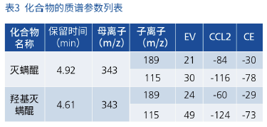 采用 EClassical 3200L-MS2 Vertical 9100 三重四極桿液質聯(lián)用系統(tǒng)進行分析,離子源參數(shù)及目標化合物質譜參數(shù)見表 2 和表 3。