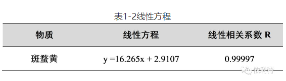 配制濃度分別為1μg/mL、2μg/mL、5μg/mL、25μg/mL、100μg/mL的標(biāo)準(zhǔn)工作液,按濃度由低至高進(jìn)樣,以標(biāo)準(zhǔn)品濃度為橫坐標(biāo),峰面積為縱坐標(biāo),斑蝥黃的線性相關(guān)性結(jié)果如下。
