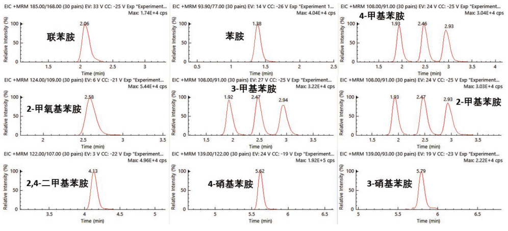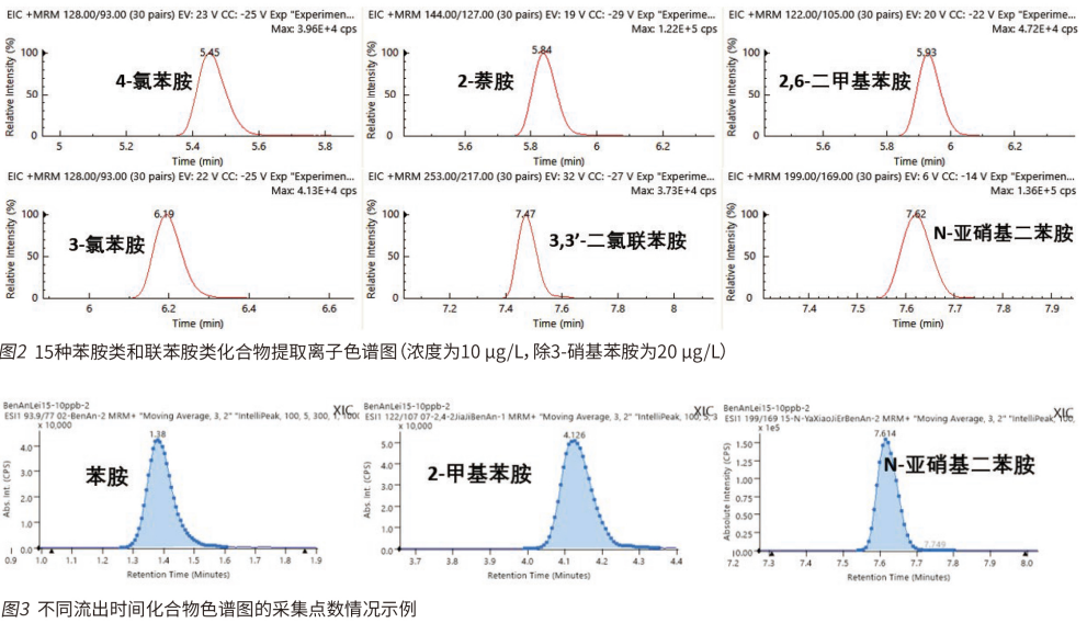 本方法采用一針進樣同時測定 13 種苯胺類和 2 種聯(lián)苯胺類化合物,圖 1 和圖 2 中分別展示了 15 種化合物的 MRM 疊加譜圖和提取離子色譜圖。可見各個化合物的峰型對稱,所有異構(gòu)體均取得良好的分離,并保證每個色譜峰上有足夠的采集點數(shù),以便獲得準確的結(jié)果及優(yōu)異的重復(fù)性。
