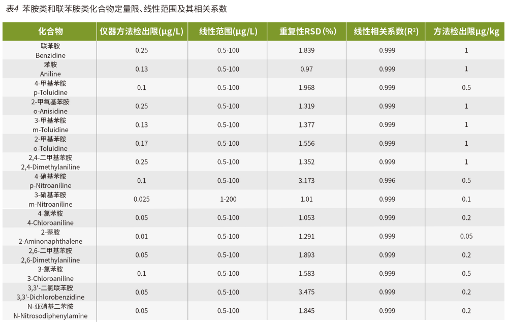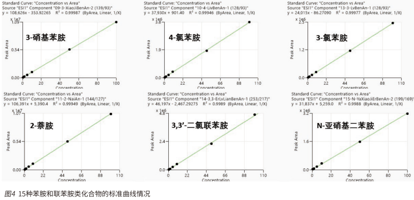用含 25% 的甲醇水溶液稀釋 15 種苯胺類和聯(lián)苯胺類化合物的混合標準溶液,制成 0.5μg/L-100μg/L 的系列校準標準溶液,其中除 3 - 硝基苯胺為 1μg/L-200μg/L,并繪制標準曲線。圖 4 為 15 種化合物的標準曲線情況。其中各個化合物在線性范圍內(nèi),線性關(guān)系均較好,相關(guān)系數(shù) R 均大于 0.995。同時考察了儀器方法的檢出限及定量限濃度的 6 針重現(xiàn)性測試(見表 4),實驗結(jié)果表明,該儀器方法對于測定 15 種化合物具有優(yōu)異的線性及重現(xiàn)性,以及較高的靈敏度。