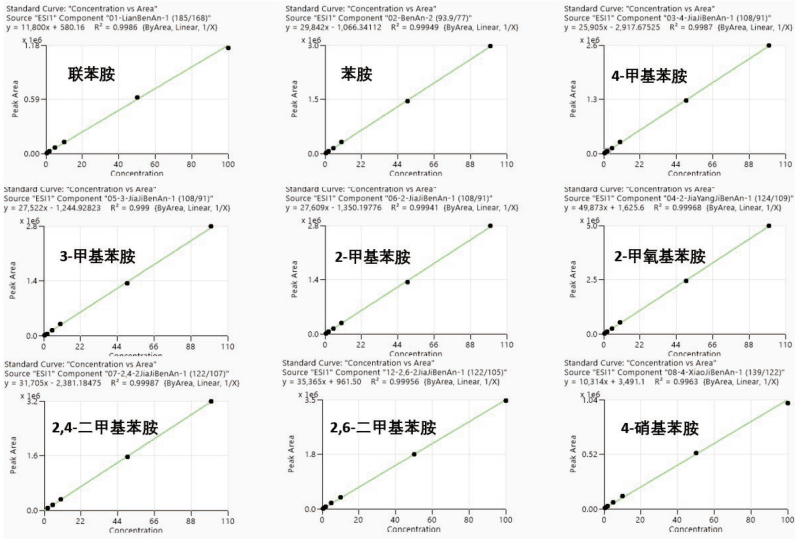 本文采用 EClassical 3200L-MS2 Vertical 9100 三重四極桿液質(zhì)聯(lián)用系統(tǒng)建立了快速、高靈敏度和可靠的 LC-MS/MS 實驗方法測定土壤和沉積物中 15 種苯胺類和聯(lián)苯胺類化合物的含量。本方法具有分析速度快、靈敏度高等特點,且檢出限低于 HJ 1210-2021《土壤和沉積物 13 種苯胺類和 2 種聯(lián)苯胺類化合物的測定 液相色譜 - 三重四極桿質(zhì)譜法》標準中限量的要求,同時數(shù)據(jù)顯示,其重復(fù)性和線性均較好,為后期高通量的樣品測定提供可靠的保障。
