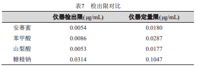 配制濃度分別為 5μg/mL、10μg/mL、20μg/mL、30μg/mL、40μg/mL、50μg/mL、100μg/mL 的標(biāo)準(zhǔn)工作液,按濃度由低至高進(jìn)樣,以標(biāo)準(zhǔn)品濃度為橫坐標(biāo),峰面積為縱坐標(biāo),繪制校準(zhǔn)曲線,安賽蜜、山梨酸、糖精鈉混合標(biāo)準(zhǔn)品的線性相關(guān)性結(jié)果如下: