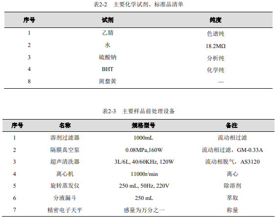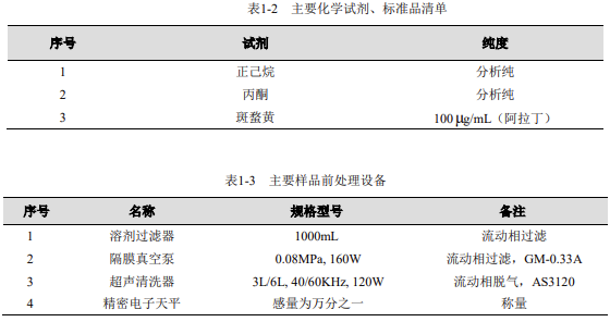 實驗過程中其它玻璃器皿還包括容量瓶 (100mL、50mL、25mL、10mL)、移液槍 (0~1000μL,0~5000μL)、移液槍槍頭 (1mL,5mL)、一次性 PVC 手套、一次性口罩、進樣針、濾膜等若干。