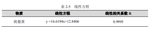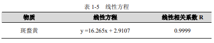 配制濃度分別為 1μg/mL、2μg/mL、5μg/mL、25μg/mL、100μg/mL 的標準工作液,按濃度由低至高進樣,以標準品濃度為橫坐標,峰面積為縱坐標,斑蝥黃線性相關性結果如下。