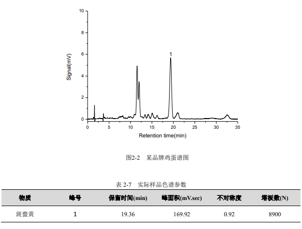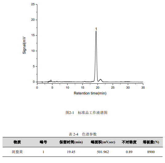 (圖 2-1 標準品工作液譜圖,橫坐標為 Retention time (min),范圍 0-35,縱坐標為 Signal (mV),范圍 0-25,圖中斑蝥黃對應峰的保留時間約為 19.45min)