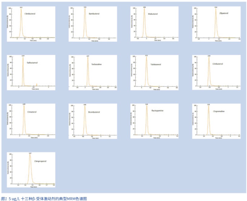 在上述實(shí)驗(yàn)條件下得到的十三種 β- 受體激動(dòng)劑的典型 MRM 色譜圖見圖 1。十三種 β- 受體激動(dòng)劑的藥物可以實(shí)現(xiàn)色譜分離且峰形良好,經(jīng)過優(yōu)化的梯度可以和基質(zhì)干擾分開。