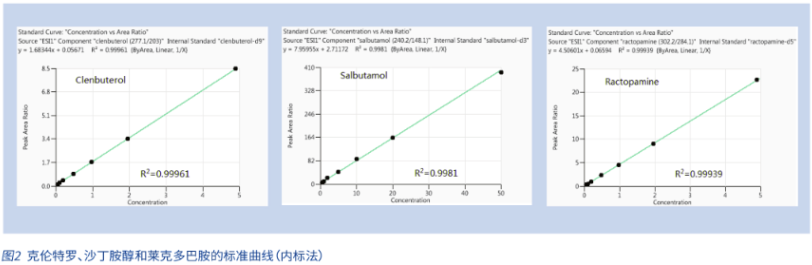 十三種 β- 受體激動(dòng)劑在 0.05μg/L-5μg/L 濃度范圍內(nèi)均呈現(xiàn)良好的線性關(guān)系,相關(guān)系數(shù)≥0.995,典型代表化合物克倫特羅、沙丁胺醇和萊克多巴胺的標(biāo)準(zhǔn)曲線(內(nèi)標(biāo)法)見圖 2。