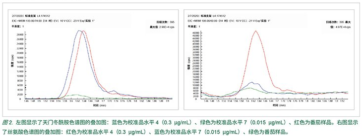 代表性數(shù)據(jù):天門冬酰胺、絲氨酸等氨基酸的校準曲線線性優(yōu)異(見圖 1),不同濃度校準品與番茄樣品的色譜圖重疊度高,分離效果清晰(見圖 2)。