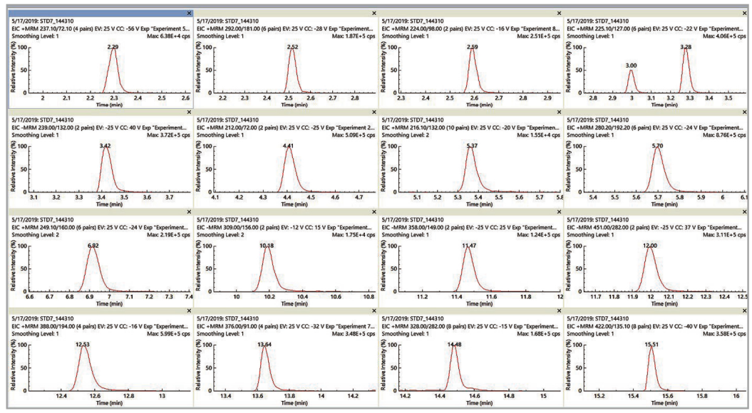 在上述實(shí)驗(yàn)條件下得到數(shù)種農(nóng)藥化合物的 MRM 色譜圖,見(jiàn)圖 1。