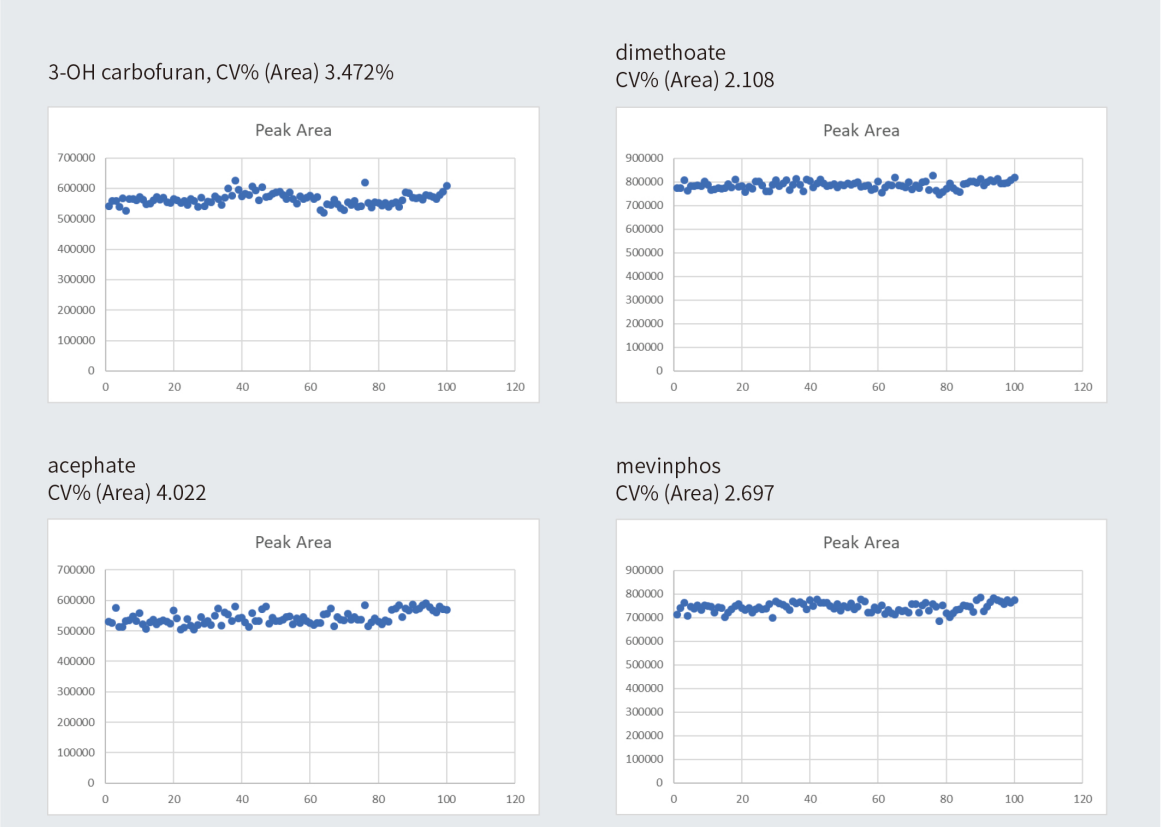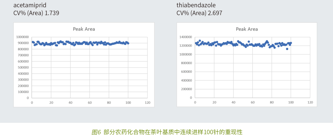 面對(duì)農(nóng)產(chǎn)品檢測(cè)越來(lái)越多樣和復(fù)雜的檢測(cè)樣品,三重四極桿質(zhì)譜的穩(wěn)定性和抗污染能力對(duì)于儀器的使用和維護(hù)來(lái)說(shuō)也是非常重要的內(nèi)容。以待測(cè)樣品中常見(jiàn)而且非常復(fù)雜的茶葉基質(zhì)為例 (見(jiàn)圖 5),基質(zhì)加標(biāo)濃度 20ng/mL 連續(xù)進(jìn)樣 100 針,測(cè)試 MS2 Vertical9100 的耐臟性能。圖 6 展示了部分農(nóng)藥在 100 針進(jìn)樣條件下峰面積重現(xiàn)性均小于 5% 的良好數(shù)據(jù)。Elite MS2 Vertical 9100 系列三重四極桿質(zhì)譜具有獨(dú)特的 "不怕臟、臟不怕、怕不臟" 的硬件設(shè)計(jì):1. 帶有反吹干燥氣的雙錐孔質(zhì)譜接口結(jié)合離子源主動(dòng)排放廢氣泵設(shè)計(jì),具有優(yōu)異的抗污染能力,長(zhǎng)時(shí)間無(wú)需維護(hù)離子源;2.HSID 熱表面誘導(dǎo)去溶劑質(zhì)譜接口技術(shù),320° 加熱的質(zhì)譜接口使得儀器有效防止樣品中的復(fù)雜基質(zhì)污染儀器,長(zhǎng)時(shí)間運(yùn)行免于頻繁維護(hù);3. 層流氣離子導(dǎo)向技術(shù),提高離子傳輸效率避免頻繁的儀器調(diào)諧。優(yōu)異的耐臟基質(zhì)和污染物的硬件設(shè)計(jì),保證滿足檢測(cè)靈敏度要求的同時(shí),大程度使得儀器免于頻繁停機(jī)清洗和維護(hù),大大提高了儀器的利用效率。