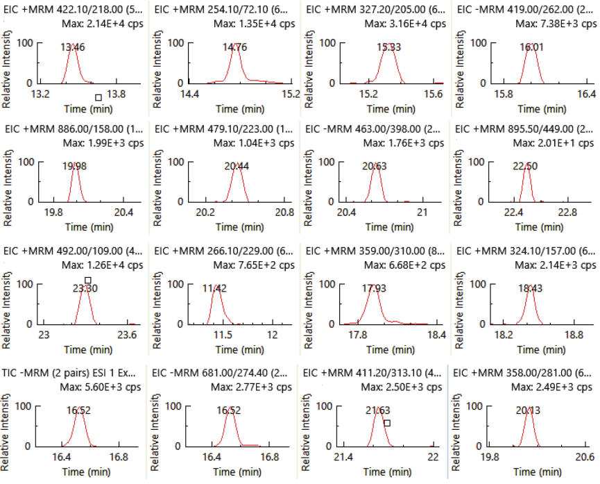 本方法采用一針進(jìn)樣,通過Time Managed MRM正負(fù)切換模式同時(shí)測定331種化合物及其45種代謝物,共375個(gè)化合物,其中365種化合物采用正離子模式采集,10種化合物采用負(fù)離子模式采集。圖1中展示了375種化合物的提取離子疊加譜圖,圖2中是單獨(dú)10個(gè)負(fù)離子化合物的提取離子色譜圖。經(jīng)過優(yōu)化色譜洗脫條件,圖3展示了不同保留時(shí)間的部分農(nóng)藥化合物的提取離子色譜圖。各個(gè)化合物峰型對稱,軟件中TimedMRM功能目動完成375個(gè)化合物的軒留時(shí)間分配,保讓每個(gè)色語峰上有足夠的來集點(diǎn)教,以使獲得準(zhǔn)確的結(jié)果為優(yōu)異的重復(fù)性,不同流出時(shí)間的代表性化合物的色譜圖采集點(diǎn)數(shù)情況示例詳見圖4。