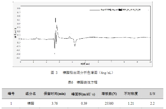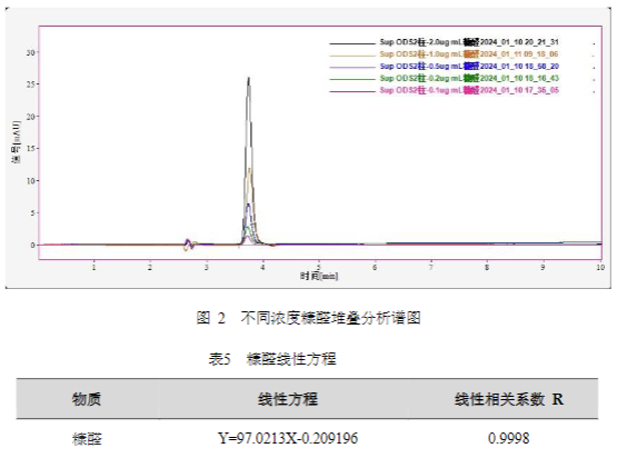 將糠醛標準工作溶液,按 2.2 中色譜條件進行分析,糠醛的線性如下表所示: