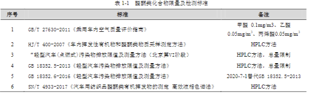 以下標(biāo)準(zhǔn)分別對(duì)汽車尾氣、內(nèi)飾、車內(nèi)空氣限量標(biāo)準(zhǔn) / 檢測(cè)方法進(jìn)行了規(guī)范,以盡量減少醛酮化合物的污染: