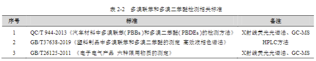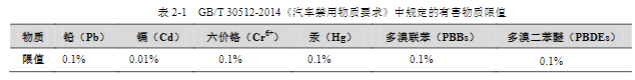 隨著經(jīng)濟(jì)的發(fā)展,人們對(duì)汽車的安全性、舒適性要求逐漸提高,對(duì)汽車生產(chǎn)中使用的有毒有害物質(zhì)限量要求也越來(lái)越嚴(yán)格。多溴聯(lián)苯和多溴二苯醚作為常用的阻燃劑,在汽車車體和內(nèi)飾中廣泛存在。GB/T 30512-2014 《汽車禁用物質(zhì)要求》對(duì)汽車零部件的禁用有害物質(zhì)的含量限值進(jìn)行了要求,詳見下表: