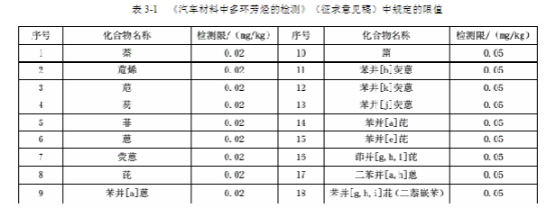 汽車內(nèi)有多種物質(zhì)可能向車內(nèi)釋放多環(huán)芳烴,如汽車的配件 (坐墊、座椅套)、車內(nèi)飾 (門內(nèi)護(hù)板) 以及生產(chǎn)車時(shí)使用的油漆、稀釋劑、粘合用的膠水,甚至一些劣質(zhì)的香水、空氣凈化劑等,都可能含有多環(huán)芳烴。全國(guó)汽車標(biāo)準(zhǔn)委員會(huì) 2019 年 5 月 13 日公布了《汽車材料中多環(huán)芳烴的檢測(cè)》(征求意見稿),該標(biāo)準(zhǔn)是新制定的行業(yè)標(biāo)準(zhǔn),將作為 GB30512《汽車禁用物質(zhì)要求》的修訂版配合標(biāo)準(zhǔn)實(shí)施,預(yù)計(jì) 2020 年開始執(zhí)行。