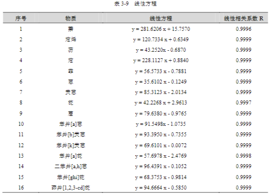 將 16 種多環(huán)芳烴標(biāo)準(zhǔn)工作溶液,按 3.3 中色譜條件進(jìn)行分析,16 種多環(huán)芳烴線性如下表所示。