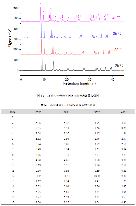 進(jìn)樣分析濃度為 5μg/mL 的 16 種多環(huán)芳烴和 2μg/mL 十氟聯(lián)苯工作液,使用 3.3 中的色譜條件,實(shí)驗(yàn)溫度分別為 25℃、30℃、35℃、40℃,結(jié)果如下圖所示: