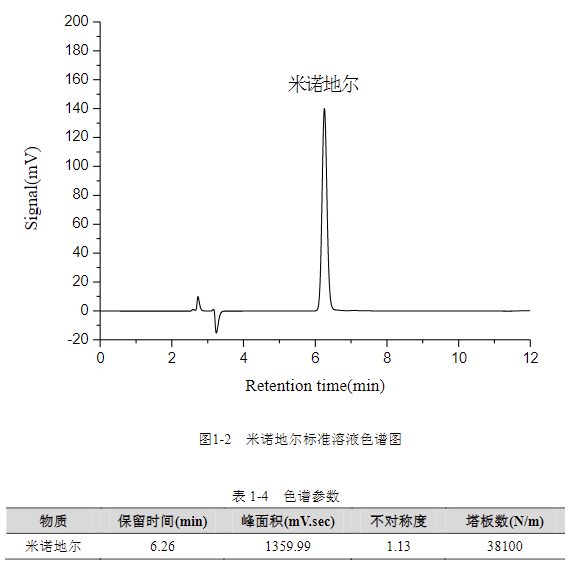 進樣分析濃度為 20.0mg/L 米諾地爾標(biāo)準(zhǔn)工作液,使用 1.3.3 中的色譜條件,結(jié)果如下圖所示: