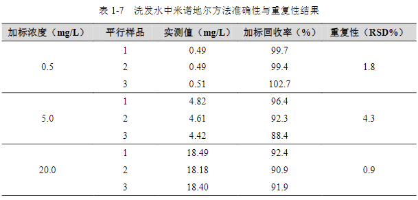 在添加濃度 0.5mg/L、5.0mg/L、20.0mg/L 濃度范圍內(nèi),測得回收率 88.4%~102.7%,相對標(biāo)準(zhǔn)偏差為 0.9%~4.3%。