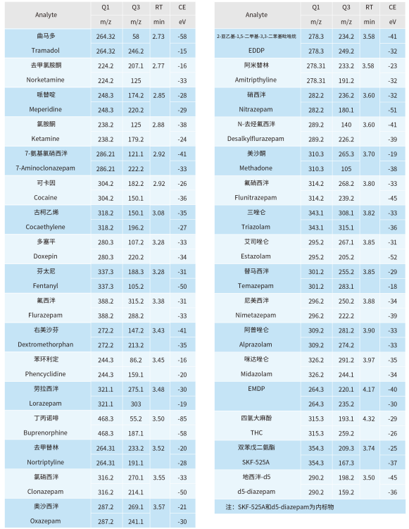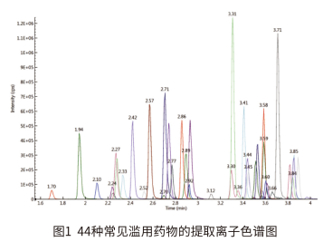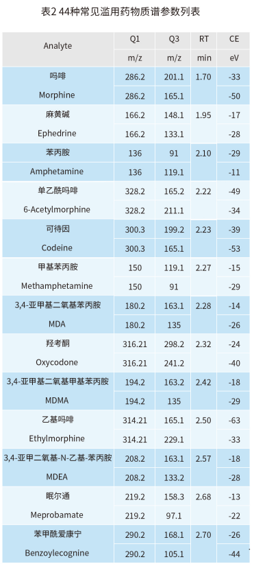 MS2 Vertical 9100 建立了快速、高靈敏度和可靠的 LC-MS/MS 實驗方法測定常見 44 種濫用藥物的含量。實驗結(jié)果表明,本方法具有分析速度快、線性范圍寬和靈敏度高等特點,適用于司法刑偵領域中常見濫用藥物的定性定量分析。