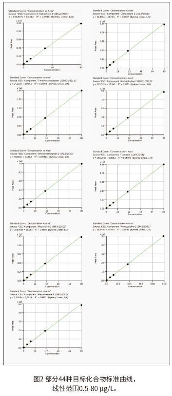 圖 1 中展示了采用目標化合物濃度為 10.0μg/L 的提取離子色譜圖。各個化合物的峰型對稱,獲得優(yōu)異的色譜分離效果,僅需 4.5min 即可完成目標化合物的分離,大大提高分析效率。