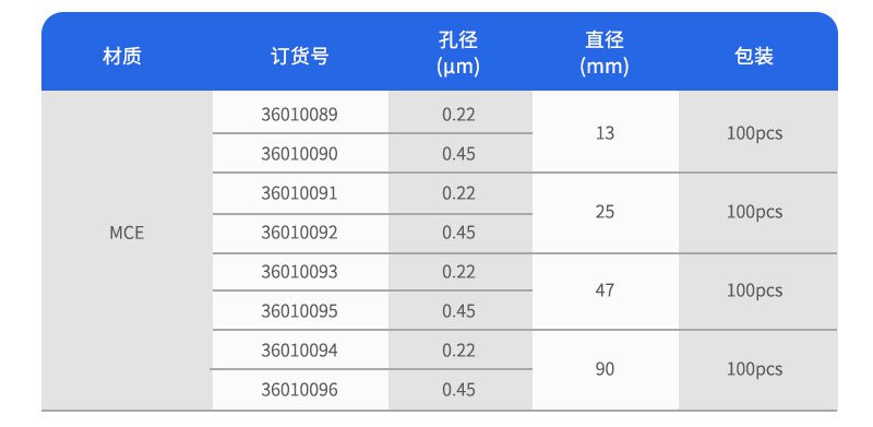MCE系混合纖維素酯膜,是由硝酸纖維素(NC)和醋酸纖維素(CA)混合制成,他比純硝酸纖維素膜具有更好的平整性和均勻性,為檢測(cè)顆粒物和微生物提供了更好的顏色對(duì)比,具有更低的醋酸纖維素含量,以及更加的生物相容性。