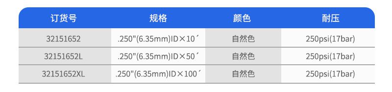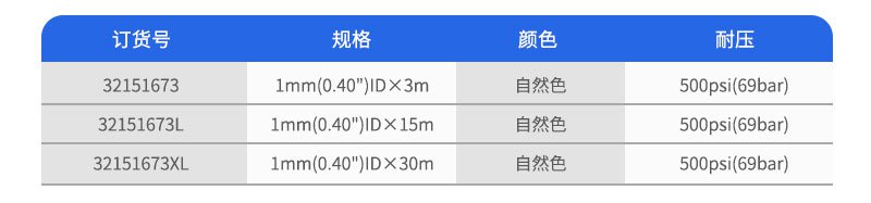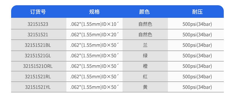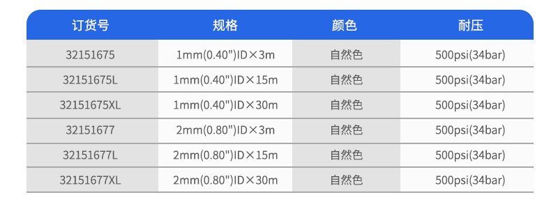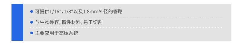 該種管有1/16"和1/8"外徑兩種規(guī)格,外徑和內(nèi)徑的公差分別為±0.001"和±0.003"。這種聚合物材料在100℃操作溫度下不會降低其機械強度。
