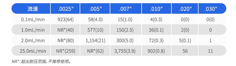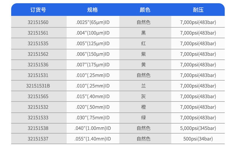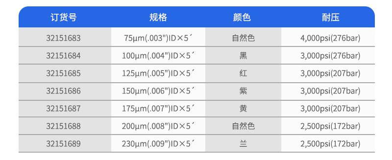 所有PEEK毛細管的內(nèi)徑和外徑的公差均在±0.0005"以內(nèi)。