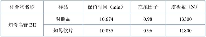 知母樣品色譜圖相關(guān)參數(shù)表